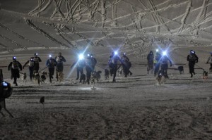 Histoire de se maintenir chaud nous faisons quelques accélérations face à la piste de luge, les chiens sont surmotivés à la fois par l’ambiance, la nuit et la neige… Ce sont les filles qui partiront en premier, du coup Isa et Canelle vont se positionner dans la raquette de départ pendant qu’avec Zawa et les canicrosseurs hommes nous stationnons à l’extérieur. Zawa commence d’ailleurs à bien monter en pression.