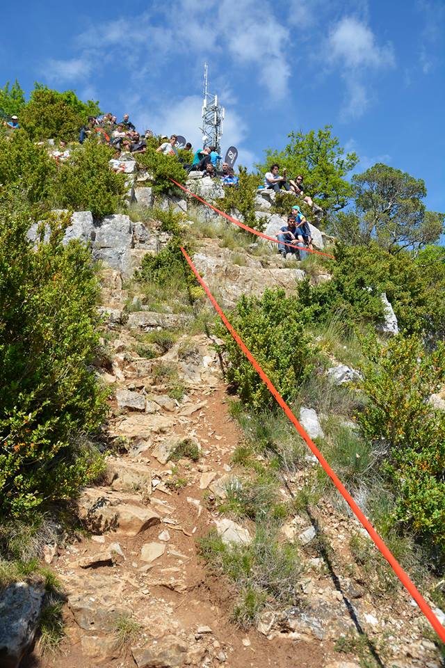 Puis au détour d’un lacet, le mur final se dresse devant moi. Mais il n’est pas seul, il y a là près de 300 personnes réparties sur les rochers, ça crie, j’entend des cloches, j’entend même Joan Jett et son I love rock and roll, ben oui normal quoi y a même un DJ en haut, tout en haut. Le top, ça me relance même si mon allure doit avoisiner celle de la tortue peu avant l’hibernation. Les encouragements font chaud au coeur. Jamais je n’ai connu pareille chose. Un truc à vous dresser les poils, d’ailleurs ils étaient tous au garde à vous.