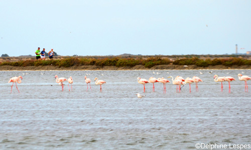 C’est un peu comme si j’avais changé de planète, d’une mer relativement agitée, je me retrouve dans le calme des étangs. Parfois une mouette trouble le silence, je suis seul et j’apprécie. De part et d’autres je me retrouve à une vingtaine de mètres de colonies de flamants roses qui ne semblent pas effrayés par mon passage. Peu à peu j’ai la sensation que le vent se renforce encore plus, il était déjà gaillard mais là je trouve qu’il soulève de plus en plus de poussières. Je suis obligé souvent de plisser les yeux afin d’éviter d’avoir du monde entre mes yeux et mes lentilles.