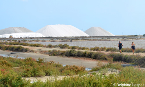 Tout à coup, face à moi se dresse une immense montagne de sel entourée de petites collines des Salins du Midi. Cet Everest salé est à environ 800 mètres de moi mais je vais devoir marcher pour le rallier tant le vent est féroce à ce moment là, je ramasse une écume plus que iodée qui me brule le visage déjà bien buriné par mes 40km sous le soleil. C’est dur, par moment je me surprend à serrer les dents et à m’encourager à haute voix (pas les deux en même temps, n’essayez pas c’est pas possible). A la montagne de sel je trottine à nouveau, les cannes sont HS mais j’arrive à tenir un petit 7’10 au kil. Et en sortant des Salins du Midi tout au bout j’aperçois Marsou, il est venu à ma rencontre pour faire les deux derniers kilomètres. Un coup d’oeil au GPS, Ouais … J’ai fait un Marathon, 42km au compteur mon premier, mais pour l’instant la question est comment je vais faire ces deux derniers kils. Marsou m’encourage tout le long, de mon côté je serre les dents et pour la première fois en course à pieds les larmes me montent aux yeux et c’est pas la poussière qui déclenche mon système lacrymal, non, ce sont les crampes qui se font de plus en plus douloureuses.