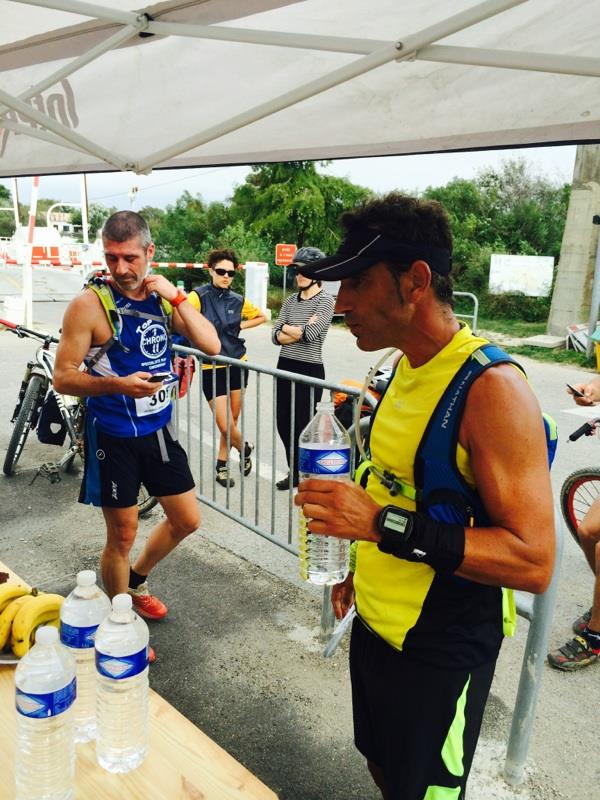 Une main dans la charcuterie, l’autre en train de mater l’écran du chrono, enfin c’est pas la main qui mate c’était pour faire un effet de style humoristique, non parce qu’on peut avoir couru 44km et faire de l’humour quand même ! Bref nous voilà en train de faire des comptes d’apothicaire avec Marsou. En effet avec le temps à décompté au passage du Bac Du Sauvage, voici les positions : La team Pic 2 a 20′ d’avance sur nous et nous avons 6′ d’avance sur la Team CCI Nîmes. Nous sommes donc 2ème scratch et 1er en Masculin …