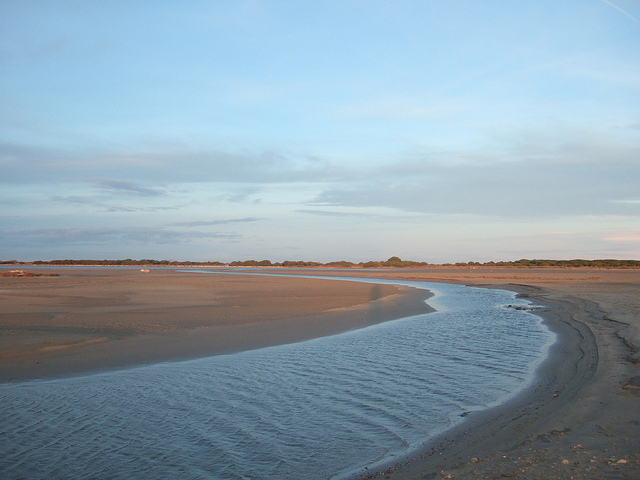 Me voilà alors parti en compagnie du deuxième relayeur de la Team Pic 2 en direction de la plage du Grand Radeau. Après deux lignes droites interminables entre canaux et joncs la voici, la plage. Elle est magnifique, par ailleurs le concurrent qui trottait avec moi m’a laché peu à peu sur les 3km qui précédait le Grand Radeau. Les vélos l’ont suivi, je me retrouve seul face à la mer, instant juste magique. C’est vent Marin et la mer bouge pas mal, personne à l’horizon, juste l’impression d’être seul au monde et de vivre un instant privilégié. Rapidement les idées se remettent en place il faut traverser un canal d’une quinzaine de mètres avec de l’eau à mi mollet, pile à cet endroit des promeneurs à cheval traversent, je me sens tout petit d’un coup à côté des chevaux, en revanche l’eau sur le moment me refroidit les tendons.