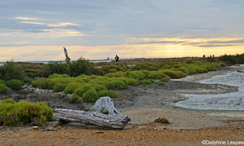 Pour l’heure nous arrivons à Vauvert, repérage du lieu d’arrivée, les arènes, retrait des dossards, et hop c’est reparti pour une heure de route vers Salin-de-Giraud, là où demain matin 7 heures le départ sera donné. Après avoir trouvé un lieu sympa ou planter les tentes non loin du stade voila que la première épreuve est lancée, enfin pour Kent surtout. A peine les tentes jetées dans l’herbe, v’là-t’y pas qu’une armée de mosquitos s’empare du campement. Branle bas de combat ! Mais trop tard Kent est déjà salement blessé, pas loin de 10 moustiques assoiffés de sang l’ont piqué. Marsou a eu quelques piqûres et, de mon côté, j’ai de la chance, je suis toujours étanche pas un seul ne s’est posé sur moi ! Je dois avoir le sang de moins bonne qualité. En attendant, on ne va pas se laisser abattre, plâtrée de pâtes, saucisse de foie grillée, quelques binouzes, on est toujours au top sur les bivouacs. Mais bon il est près de 23 heures direction les tentes, un dernier check dedans, pour voir s’il n’y a pas quelques suceurs de sang et ZZZzzzzz…. Enfin jusqu’à trois heures du mat où le vent se lève et va nous faire finir la nuit entre deux eaux.