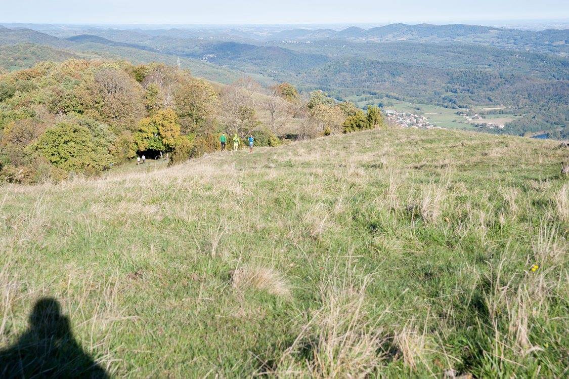 Malgré les encouragements de Kent, Max et des bénévoles qui sont sous l’arche je ne parviens pas à m’arracher plus et suis contraint de marcher, courir, marcher, courir, et oufffff ! La ligne est passée ! 29′ pour cette ascension, bon je suis dans les clous que je m’étais fixé, moins d’une heure pour les 2 manches. Je file vers le ravito, m’enquiers des chrono de Kent et de Max 20′ et 22′, nickel ça ! Nous profitons un peu du panorama, superbe, Foix à nos pieds ressemble à une maquette, et la vue sur la vallée, toute baignée de soleil, est magnifique. Cependant pas trop le temps de squatter, si on veut redescendre tranquillou sans laisser de jus il faut y aller… Où ça ? Ben vers le départ de la manche N°2, St Sauveur.