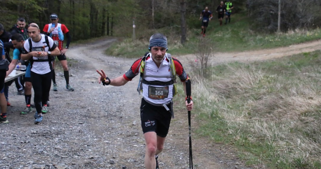 Après pas mal de passages en sous bois, souvent cerné par la brume, voici que voilà le Pech Tignous à 1100 mètres, point culminant du trail, il va y avoir un peu de descente jusqu’à Coudons et je compte bien en profiter, j’enfile mon habit de descendeur (il est virtuel je vous rassure), commute le cerveau en Off et Youhou c’est parti à près de 15km/h je dévale les 800 mètres de single en sous bois, un régal ! Rapide passage au ravito et hop on repart pour de la montée, bien linéaire cette fois sur de la piste, parfait ! Je visse les bâtons aux poignets, et me cale sur un bon rythme de marche c’est parti pour 2km … Et ces 2 km musique faisant et pensées virevoltantes, je ne les vois absolument pas passer. Tant et si bien qu’arrivé au 11ème j’ai toujours mes bâtons scotchés et qu’un belle descente bien technique se présente. Je n’ai pas dépensé de jus et je me dis que je vais me faire un petit plaisir, bâtons détachés, tout à l’air ok … Fuego !!! je bascule en mode cabri et remonte sur les 2,5km de cette descente une bonne 20aine de concurrents, même si je sais que ça n’a aucune importance ça fait toujours plaisir. Et du plaisir j’en prend, c’est un super terrain de jeu qui s’ouvre à moi et je ne me prive pas de jouer dessus.