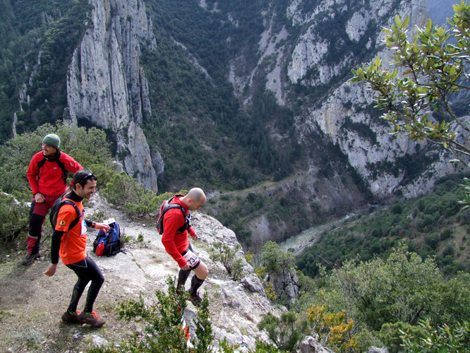 21km de parcourus et les cannes sont impec, je sais maintenant que ce tempo là je vais pouvoir l’utiliser sur des courses grands formats qui ne sauraient tarder à venir. Passage dans Belviannes et heureux de voir mon oncle et ma tante (qui nous attendent pour le repas d’ailleurs, faut pas trop trainer !) sur la place du village qui me lancent des encouragements. Hop, l’Aude traversée et me voici sur l’autre rive, une micro portion de plat me permet de reprendre des concurrents, j’en suis d’ailleurs le premier surpris et voici alors une succession de bosses et de mini-descentes qui nous amènent au dessus du château avec une vue plongeante sur Quillan.