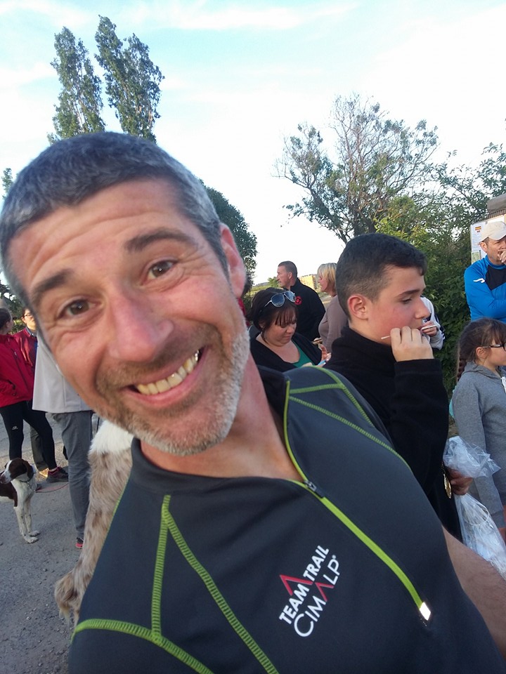 L’heure tourne, je file donc enfiler mon habit de lumière et pour le coup ce n’est pas qu’une métaphore. Dans la semaine CimAlp a transmis à toute la Team son nouveau bébé le T-shirt de trail 3D-Flex PERFECT (c’est celui de la photo), une fois de plus je dois dire qu’ils ont réussi leur coup, top qualité, excellent maintien musculaire, pas d’oppression et surtout une excellente respirabilité. Et c’est parti pour l’échauffement… Dur dur je dois dire, l’ischio gauche étant un peu en délicatesse depuis lundi, malgré un petit repos, il semble se réveiller. Bon rien de grave en soi une légère contracture sensible mais pas vraiment douloureuse, bon de toute façon je suis là ce n’est pas pour rester sur le banc, donc on zappe et Go !! En avant ! Je vais préparer Zawa et terminer l’échauffement avec. Sur les premières accélérations que nous menons, Zawa semble bien motivée, je vois qu’elle a envie de balancer du mastic. Les consignes de départ sont à présent données, compte tenu du fait que nous sommes une cinquantaine, les femmes partiront 1′ devant et ensuite, Bim ce sera à nous. Zawa est rentrée complètement dans la course, elle commence à faire de jolis bonds sur la ligne de départ, de mon côté j’essaie de faire monter le cardio.