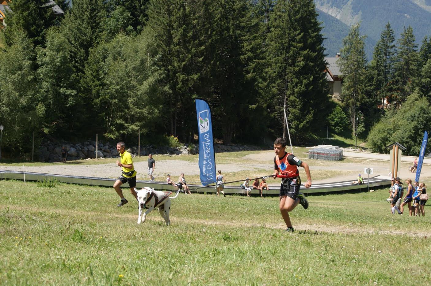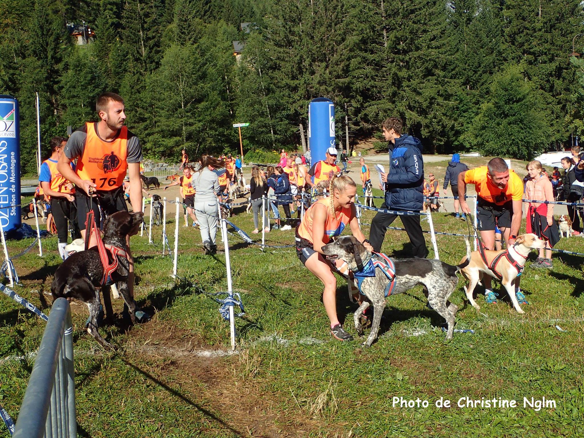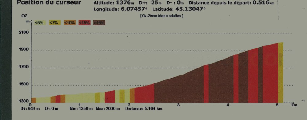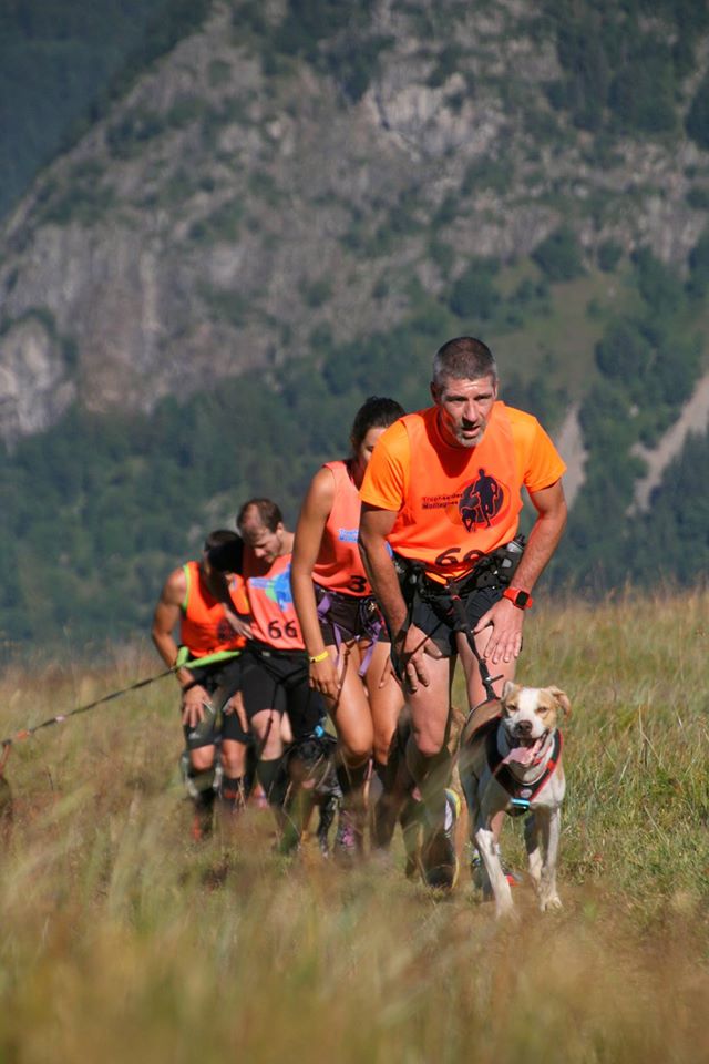Les premiers concurrents sont déjà partis et nous voilà dans les startings blocks. Peu à peu nous avançons dans la file pour finir par nous retrouver à côté d’Yvon et 30 secondes après que la ligne de devant soit partie, BIM !!! Nous voilà lancés à l’assaut de l’Alpette. Comme c’était à prévoir, Isa et la fusée Horion sont partis à Mach 12 (peut être même 13), je me retrouve alors un peu en retrait, mais ça, ben ça ne plait pas trop à ma Zazaw de voir Isa devant. Du coup sur toute la partie en faux plat montant jusqu’au terrain de tennis elle me met une traction d’enfer qui nous permet à la fois de passer un binôme de la vague précédente mais surtout de coller au duo Isa/Horion. De mon côté de la voir prendre autant de plaisir dans son harnais je met les bouchées doubles et je m’aperçois que je suis très à l’aise même quand la pente se fait plus raide.