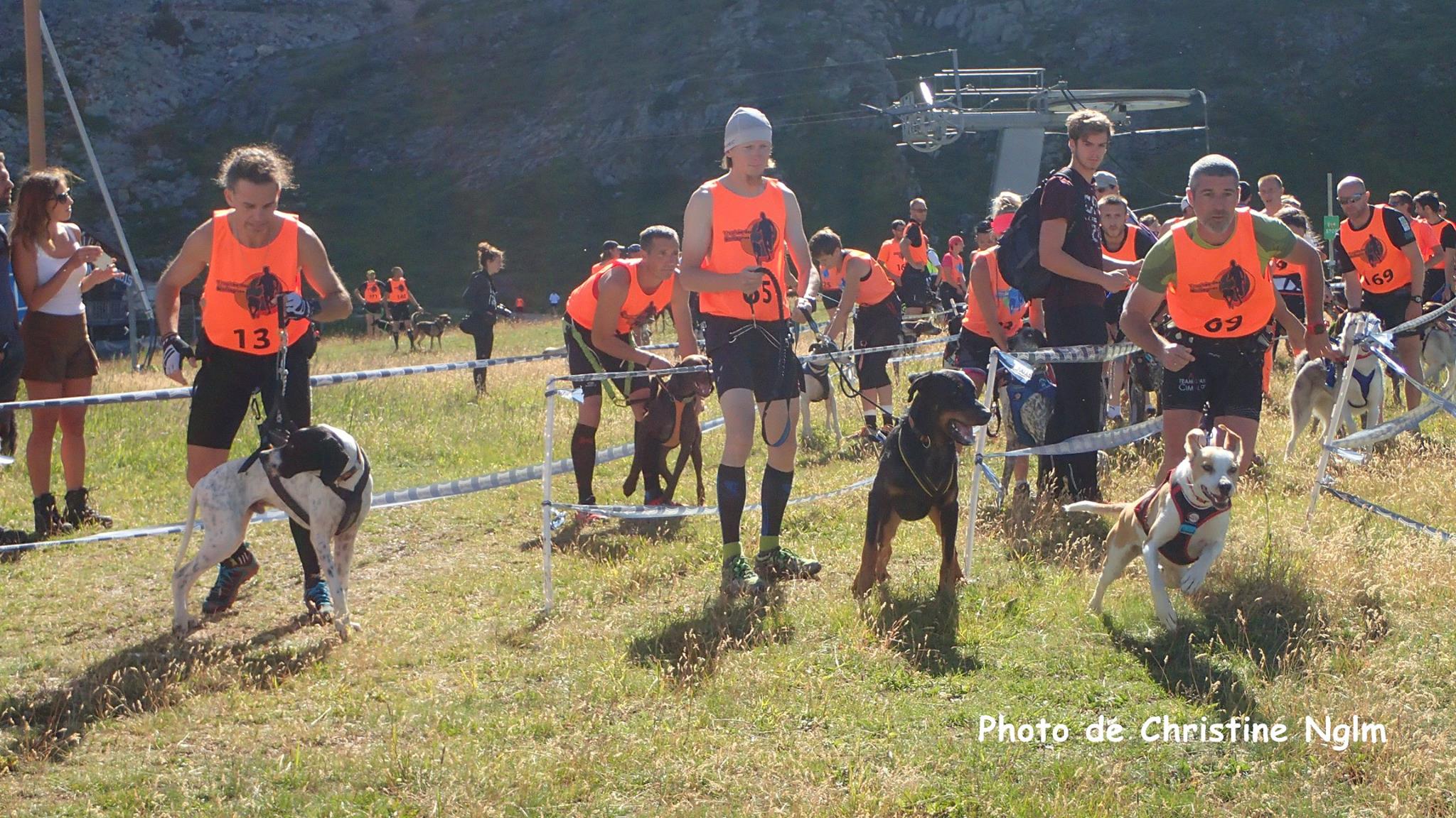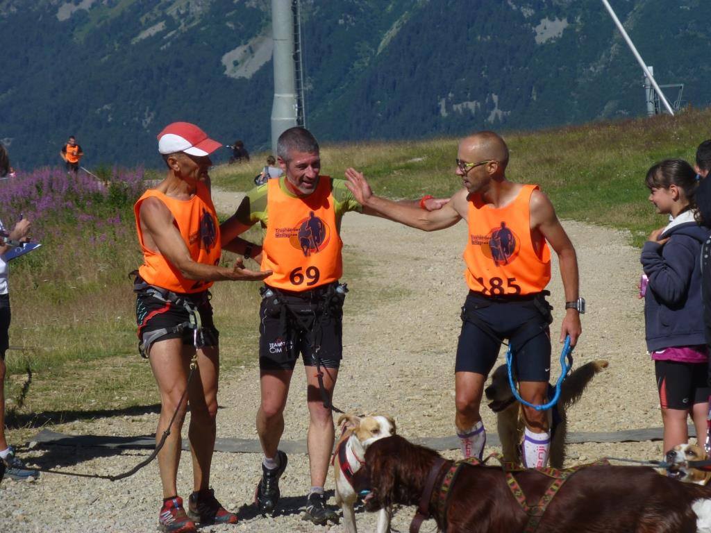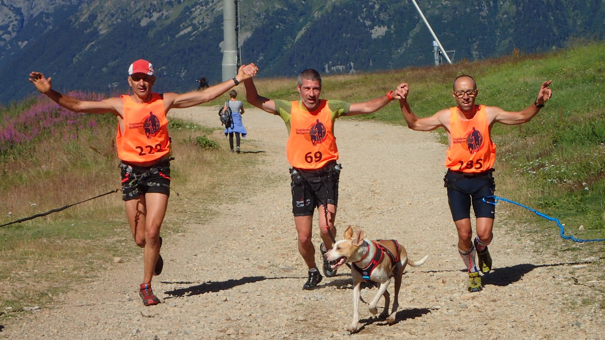Nous voilà sur le faux plat montant. Il nous reste 100 mètres à parcourir et après 5km de course qui ne nous ont pas départagé, mais au contraire sur lesquels nous avons pris du plaisir à les partager, il n’y a qu’une évidence… On se regarde et sans un mot, nous nous attrapons les mains pour terminer cette étape de concert. Comme je le dis souvent, ce n’est pas de la compet, c’est du canicross ! C’est vrai que nous aimons bien jouer la gagne, mais dans ce sport il y a avant tout un grand respect qui place la notion de plaisir bien au dessus. Ce qui fait que lorsqu’on se tape la bourre, comme ça a été le cas tout le long du TDM, c’est le plaisir qui l’emporte, le plaisir d’être là dans un cadre exceptionnel, entre amis avec nos toutous… Un grand philosophe, amateur de café, qui me ressemble physiquement beaucoup d’ailleurs (bah quoi j’ai le droit de me la péter un peu non ?) aurait résumé ceci en deux mots : « What Else ? ». Peu de temps après c’est au tour d’Isa de franchir la ligne, elle a subi une grosse chute sur le ventre, ce qui lui aura valu un piercing arraché, mais comme à son habitude elle n’a rien cédé.