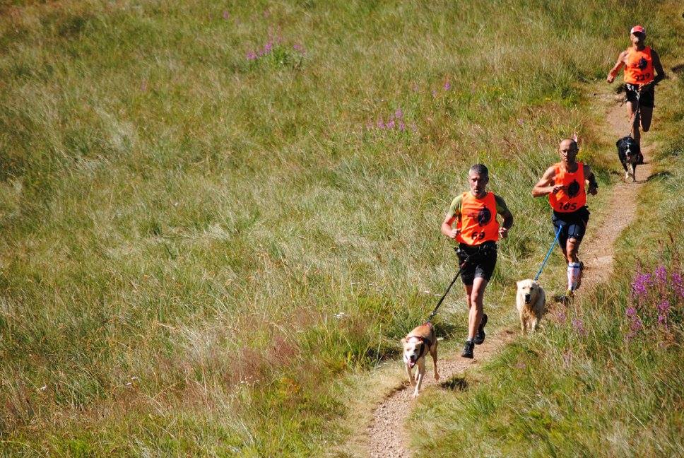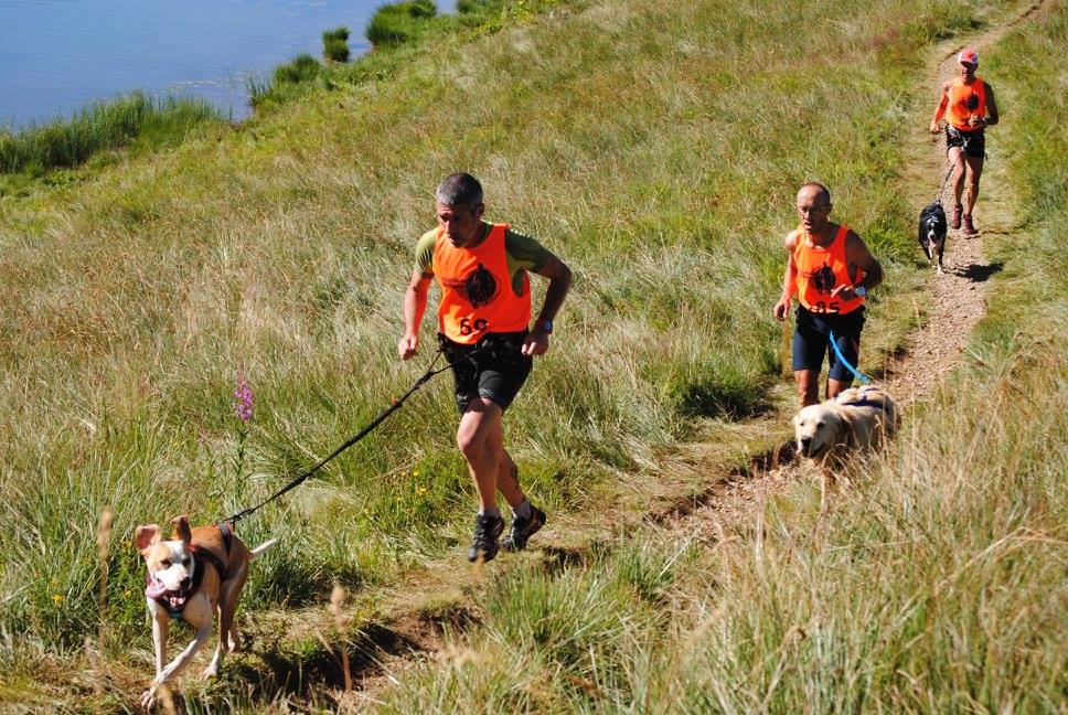 En effet, sans que nous nous gênions le moins du monde, ça va être du à toi à moi, à toi à moi, sans qu’à aucun moment personne ne fasse la différence. Peut être simplement que nous étions les 3 binômes synchro et complémentaires sur les divers terrains qui allaient suivre. Le sol passe régulièrement de la terre à la pierre et très souvent apparait une tourbière ou un cours d’eau. D’ailleurs pour rafraichir les toutous c’est juste parfait. Là aussi en fonction de quel toutou reste plus ou moins longtemps dans l’eau les places varient entre nous 3. Ce n’est plus un canicross, c’est un jeu amical de chaises musicales. Nous remontons parfois des concurrents tout en restant groupés. 1500 mètres avant l’arrivé, j’aperçois Michal, l’un des favoris, à la marche… Aïe ce n’est pas on signe pour lui, je lui demande si ça va, il répond que oui il peut marcher mais qu’il s’est fait la cheville. TDM terminé pour l’un des prétendants au podium. Et puis en haut d’une bosse l’arrivée se dessine, surplombant l’un des lacs.