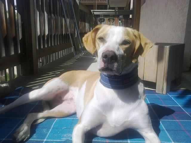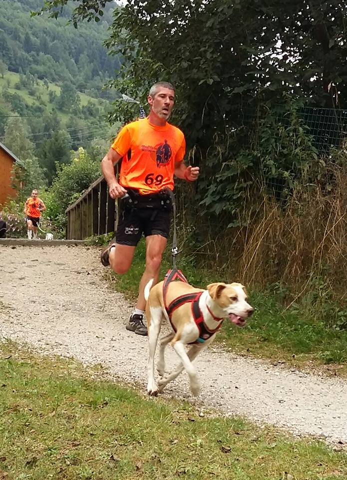 J’adore ce passage sur un single en sous bois, un peu technique, un peu raide mais avec une belle visibilité qui me permet de pouvoir appuyer. Là encore nous reprenons un ou deux binômes qui ont la gentillesse de nous laisser passer, peut être un peu surpris par le bruit des pierres glissant vers le bas. Belette, là encore, est impeccable, elle reste 2 mètres devant et se cale sur le rythme. Voici le panneau de fin du free dog, un petit coup de sifflet et Zawa vient se lier à nouveau à moi… Feu nous repartons sur la suite de la descente. Celle-ci est large et herbeuse, mais pas une herbe piégeuse qui masquerait des trous, non un peu comme une pelouse. Du coup à votre avis, on fait quoi ? Ben on mastique !!! Et c’est men mode un peu déglingo que l’on aperçoit le ravito géré de main de maître par Papy Rousseau. Zawa bois un coup, se trempe les pattounes, elle me regarde, je lui lance le traditionnel « On y va ? » et bim nous voilà repartis pour 3km tout plat. Durant les 500 premiers mètres, elle reste impériale et c’est à plus de 16km/h que nous nous dirigeons vers l’arrivée. Mais peu à peu la longe se détend. Je ne suis pas surpris car vu tout ce qu’elle a donné durant l’ascension, et étant donné que nous en sommes à notre 4ème course, il est normal qu’elle ait un petit coup de mou la belette. Cela dit nous n’avons pas fait tous ces efforts pour caler si près du but. Alors on ne va pas s’arrêter sur ce détail, histoire de ne pas rater le principal. Le tout c’est que Zawa reste devant, et à moi de jouer. La tête dans le guidon, j’arrive à maintenir une vitesse proche des 16km/h. Bon ben maintenant va falloir tenir sur 2,5km. Les cannes sont à bloc et les cuissots commencent un peu à sentir le roussi, mais pour l’instant ça va. Je m’efforce au maximum d’avoir une respiration abdominale afin de ne pas monter trop haut en pulsation. Devant, au bénéfice d’une longue ligne droite, j’aperçois 3 binômes à plus de cent mètres. Il me fallait un visuel dans le radar pour parfaire la motivation.