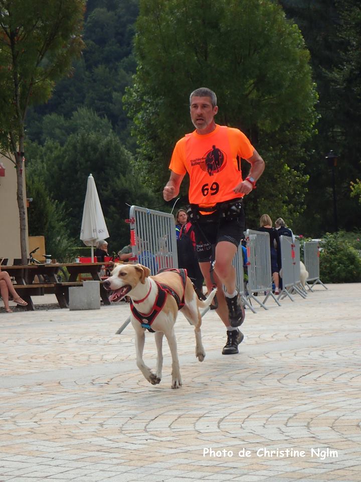 Plus que 2 kil pour les rattraper et essayer de les déposer. A ce moment précis, c’est vrai je me mets en mode compet, mais tel le nain devant l’urinoir, n’avais je pas placer la barre trop haute ? Peu à peu nous nous rapprochons des deux premiers binômes, et quand seulement 10 mètres viennent à nous séparer, Bim ! Zawa se met dans son harnais et relance la traction, trop forte et encore une fois la complémentarité est de mise. Il y a encore un autre couple en visuel, après le dépassement belette relâche un peu la pression, il nous reste moins d’un kilomètre, on peut y arriver ! Nous passons alors sur un pont et les deux virages en angles droits nous cassent un peu le tempo, dur dur de relancer la machine. Aïe, 20 mètres après le pont, l’ischio gauche se fait sensible, il y a comme un début de contracture. Mais en élevant, malgré le bobo, le tempo, bizarrement, le début de contracture semble s’effacer. A 400 mètres de l’arrivée, nous dépassons le dernier couple et lançons toutes nos forces sur la ligne droite qui précède l’arche d’arrivée. Ouf ! La ligne est passée et pour la première fois depuis le début du TDM je suis caramélisé ! Les quadris tremblent et la douleur à l’ischio gauche revient en mode grand galop. Je pars alors à la marche histoire de ne pas rester statique et vais à la rencontre d’Isa. A ce moment là je me demande d’ailleurs si tout s’est bien passée pour elle, elle qui est partie avec Canelle sachant que c’est sur cette étape que Canelle avait pris il y a 2 ans un gros coup de chaud.
