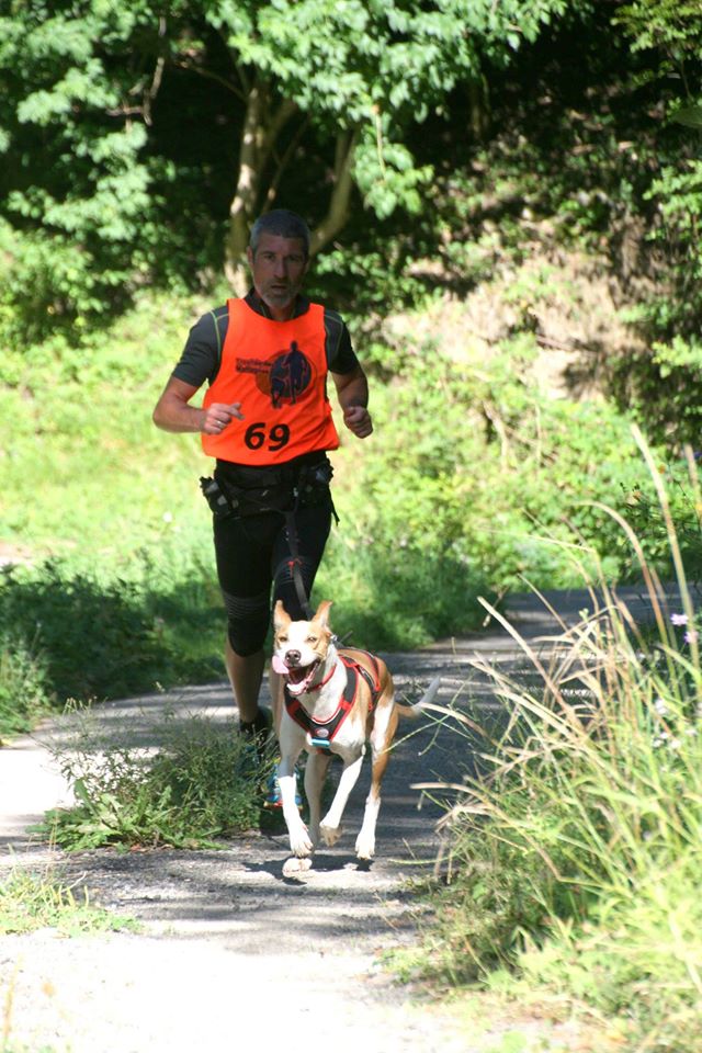 Sur les deux kilomètres de plat restant nous arrivons à tenir cette super moyenne, dommage pour cette minute perdue au départ, mais c’est le jeu ma pauvre Lucette. Le ravito de Papy Rousseau marque alors la fin du plat, c’est parti pour 2 kilos de grimpette avec 260 de D+, ça va piquer. L’objectif pour moi est d’arriver le mieux possible en haut car ensuite les 3 derniers kilos du parcours seront en faux plat descendant sur de la piste et ça j’aime ! Sur la première partie, la partie en herbe et large, Zazaw, revigorée par le ravito, me met une belle tension. Nous reprenons même un binôme. Je me dis que c’est bon si nous passons le single comme ça, nous oublierons la mésaventure du début. Mais à peine les pattounes de Zazaw pénètrent-elles dans le sous-bois marquant l’entrée du single et de la pente bien raide, que ma belette reprend son coup de mou. Elle ne va pas me gêner mais va rester longe détendue devant moi. J’ai beau essayer de grimper en mode Tchétchène (c’est pour l’image, je ne sais pas si ce sont de bons grimpeurs) je n’arrive pas à trouver un tempo solide. Durant l’ascension, qui va me sembler interminable, je vois passer pas mal de monde. Théo, Pablo entre autres, me doublent non sans m’encourager. C’est ça aussi le TDM et l’esprit canicross en général, toujours dans l’encouragement. J’ai beau lever la tête en espérant voir le haut de cette interminable grimpette, mais je n’en vois jamais le bout. Et puis après 2 ou 3 « pétous » voilà que ma Zazaw remet ça, une petite pause caca dans la côte. Bon au point où on en est c’est pas grave, mais ça aura eu pour effet de casser encore un peu plus le rythme. J’encourage ma belette mais je vois bien quelle n’est pas dans son assiette, allez ça se précise… Je lève la tête et là une centaine de mètres plus haut j’aperçois le sommet marquant le début de la piste descendante.