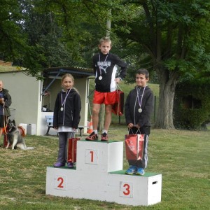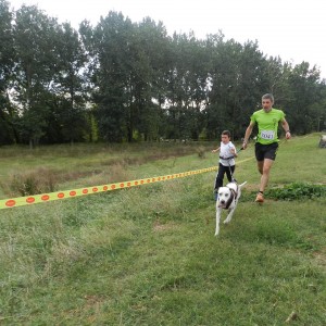 Juste après cette première épreuve, place à Matthis et à Jazz. C’est la deuxième fois que mon fils venait à mes côtés sur un canicross (sa première course avait eu lieu à Maraussan) et il devait effectuer (à quelques mètres près) la même boucle que nous 30 minutes plus tôt. Jazz n’était pas fatigué de sa course précédente, et je dus même le retenir pour ne pas que Matthis soit emporté sur un tempo trop élevé. Avec un mental d’acier, Matthis bouclera son parcours à la troisième place en 3’03″… (Pas peu fier le papa). Premier podium de la journée pour nous.